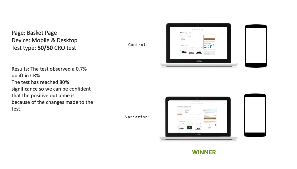 The redesigned Basket experience was implemented across mobile and desktop over two sprints. Due to its high impact, the first phase was fully A/B tested and then rolled out site-wide following positive results.